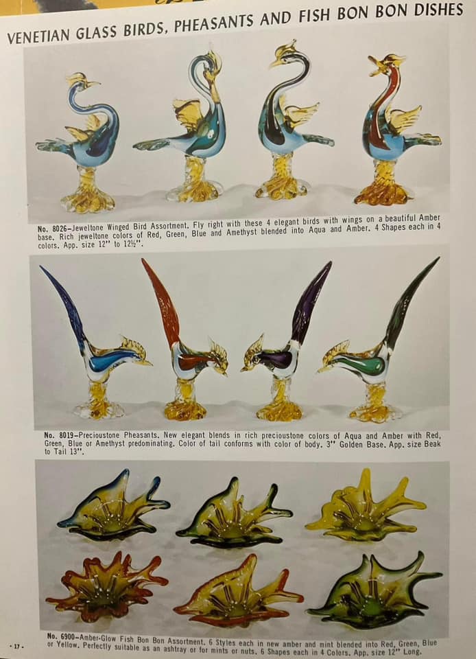 Shown below are catalogue pages from a Jordan's Importing Company (also known as J.I. Co. or JICO) Murano glass catalogue. The exact date of the catalogue is not known, but it is known that JICO was an American based import company, that imported Italian Murano and Florentine glass to the USA between the mid 1950's - early 1970's. The front cover of this catalogue has the company address, including a zip code, and as zip codes were only introduced in 1963, this catalogue must date somewhere between 1963 - early 1970's.