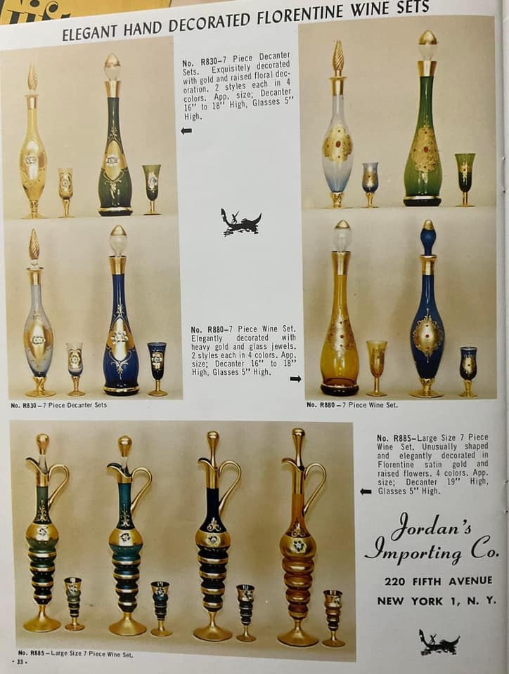 Shown below are catalogue pages from a Jordan's Importing Company (also known as J.I. Co. or JICO) Murano glass catalogue. The exact date of the catalogue is not known, but it is known that JICO was an American based import company, that imported Italian Murano and Florentine glass to the USA between the mid 1950's - early 1970's. The front cover of this catalogue has the company address, including a zip code, and as zip codes were only introduced in 1963, this catalogue must date somewhere between 1963 - early 1970's.