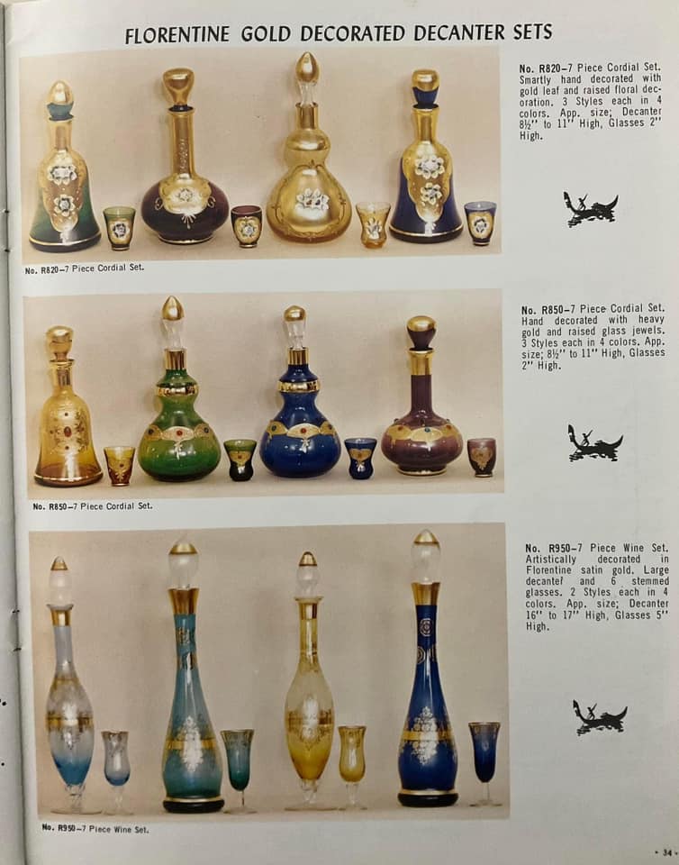 Shown below are catalogue pages from a Jordan's Importing Company (also known as J.I. Co. or JICO) Murano glass catalogue. The exact date of the catalogue is not known, but it is known that JICO was an American based import company, that imported Italian Murano and Florentine glass to the USA between the mid 1950's - early 1970's. The front cover of this catalogue has the company address, including a zip code, and as zip codes were only introduced in 1963, this catalogue must date somewhere between 1963 - early 1970's.