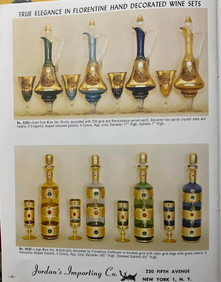 Shown below are catalogue pages from a Jordan's Importing Company (also known as J.I. Co. or JICO) Murano glass catalogue. The exact date of the catalogue is not known, but it is known that JICO was an American based import company, that imported Italian Murano and Florentine glass to the USA between the mid 1950's - early 1970's. The front cover of this catalogue has the company address, including a zip code, and as zip codes were only introduced in 1963, this catalogue must date somewhere between 1963 - early 1970's.