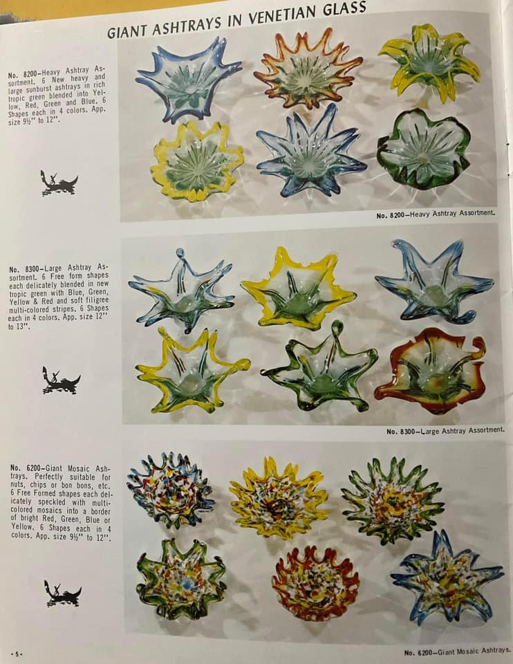 Shown below are catalogue pages from a Jordan's Importing Company (also known as J.I. Co. or JICO) Murano glass catalogue. The exact date of the catalogue is not known, but it is known that JICO was an American based import company, that imported Italian Murano and Florentine glass to the USA between the mid 1950's - early 1970's. The front cover of this catalogue has the company address, including a zip code, and as zip codes were only introduced in 1963, this catalogue must date somewhere between 1963 - early 1970's.