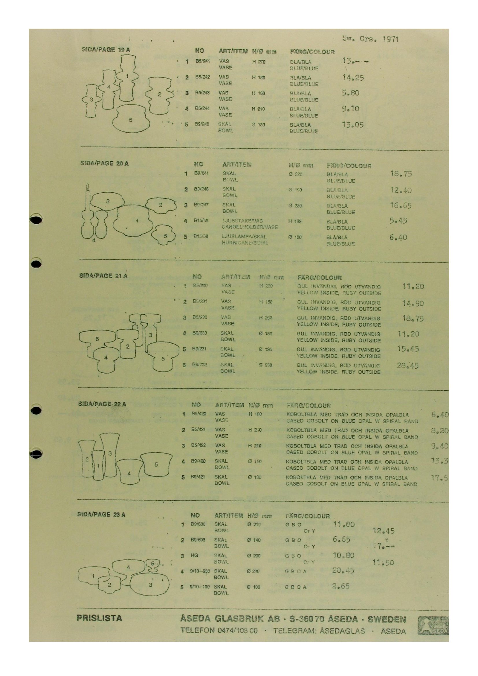 Shown below are pages from an Aseda Glasbruk Swedish glass catalogue from 1971-73.