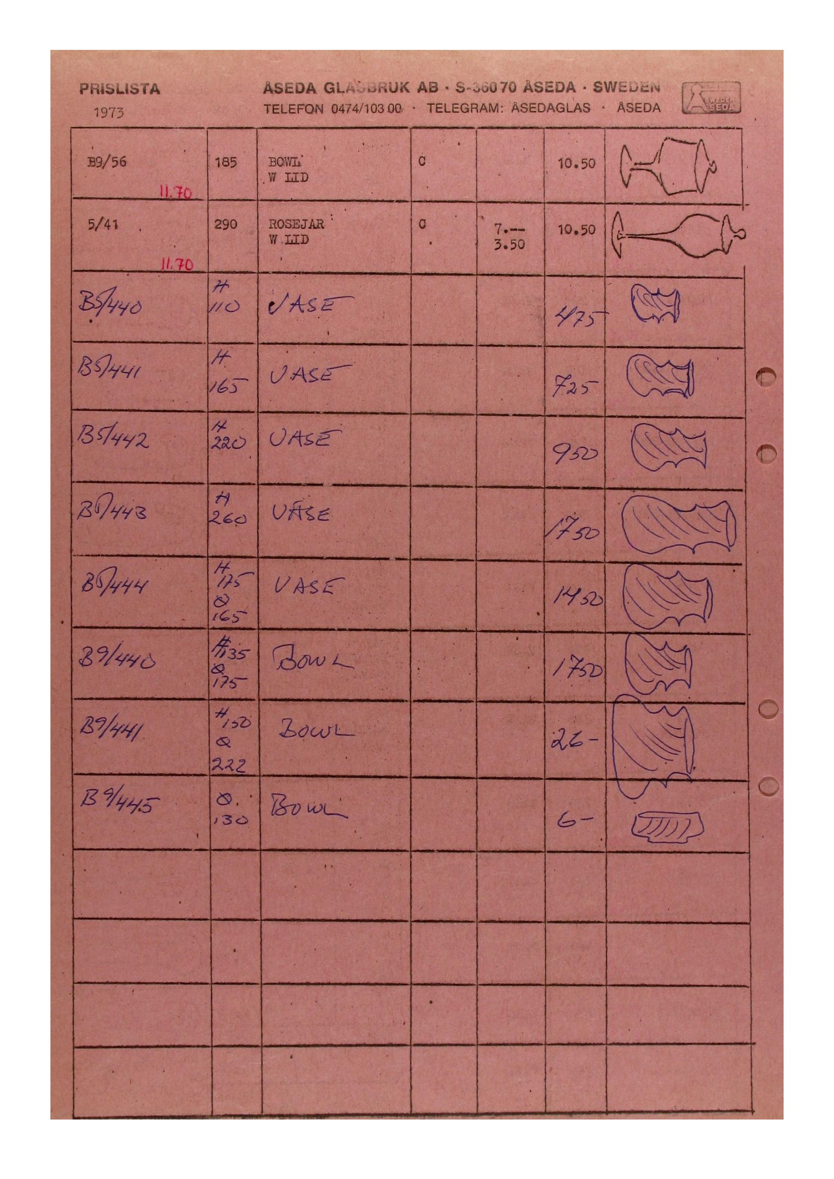 Shown below are pages from an Aseda Glasbruk Swedish glass catalogue from 1971-73.