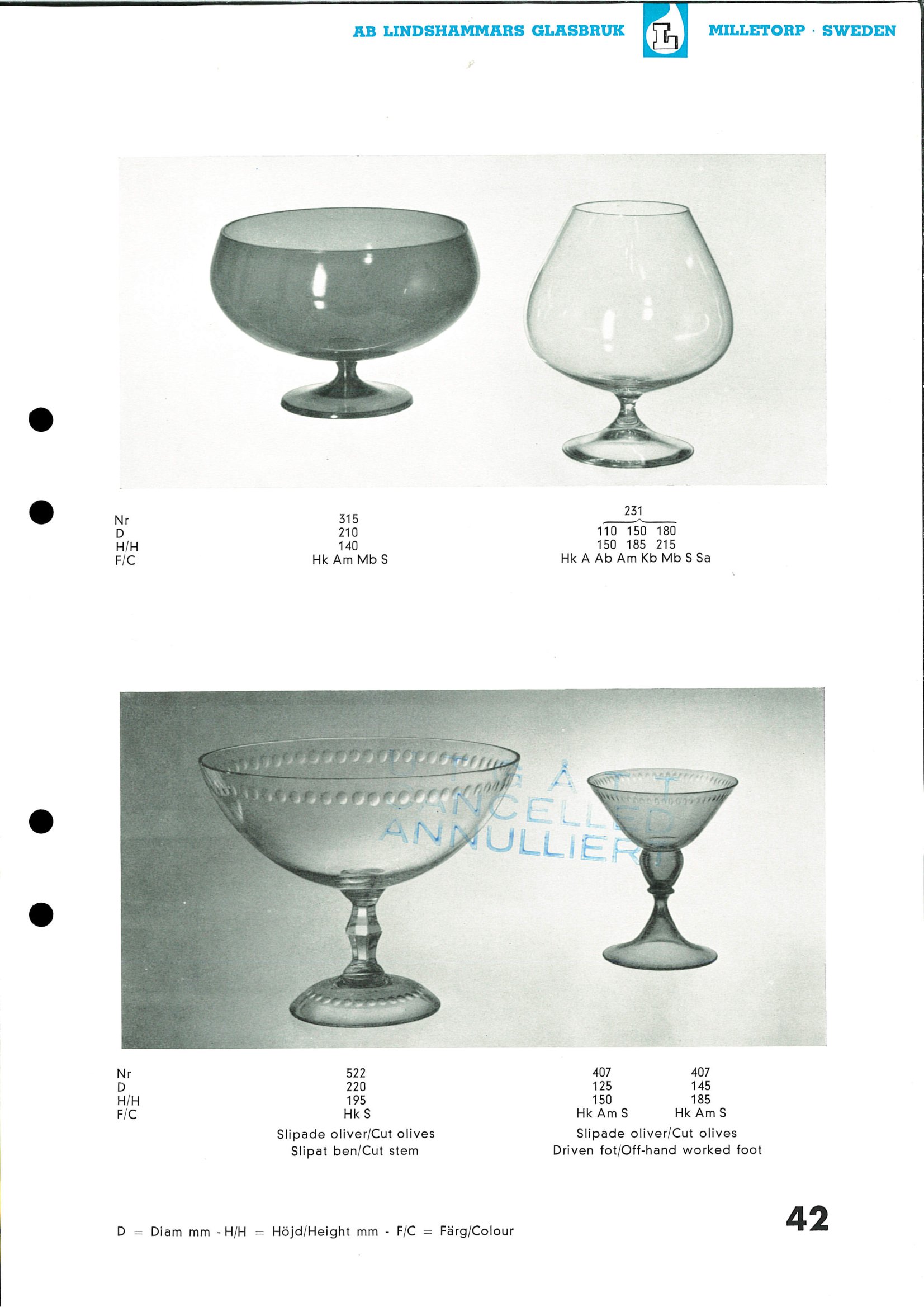 Shown below are pages from a 1950's Lindshammar Swedish glass catalogue.